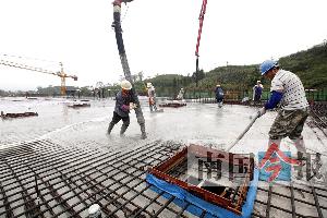 10月21日下午,工人在緯六路上澆筑混凝土。柳州市官塘大橋東接柳東新區(qū)緯六路,10月...